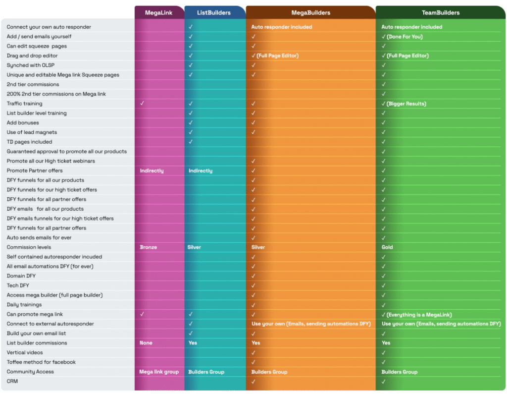 Team Builders membership costs $1997 per year, and gives you access to all tools and software found inside the Mega Builders membership + you will get extra commission bumps and two-tier commissions levels on the Mega Link.